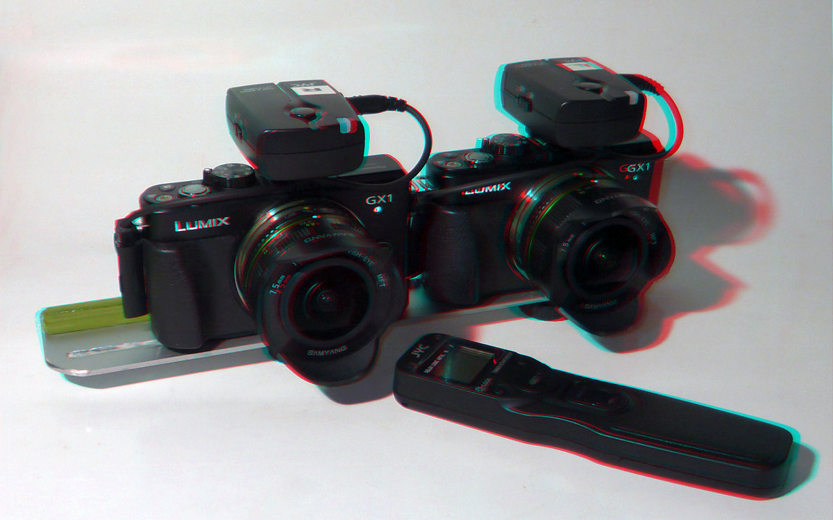 Double Panasonic GX1 + objectifs fisheye Samyang 7.5 mm. La synchronisation est réalisée en utilisant deux télécommandes sans fil. Les deux récepteurs sont réglés sur le même canal, un seul émetteur est alors nécessaire pour déclencher les deux appareils. Base minimale = 12,3 cm. Ajustable jusqu'à 27,5 cm.