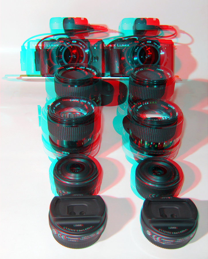 Depuis le fond : Samyang 7.5mm, Canon 50mm macro, Canon 100mm, Panasonic 14mm, Panasonic 3D.