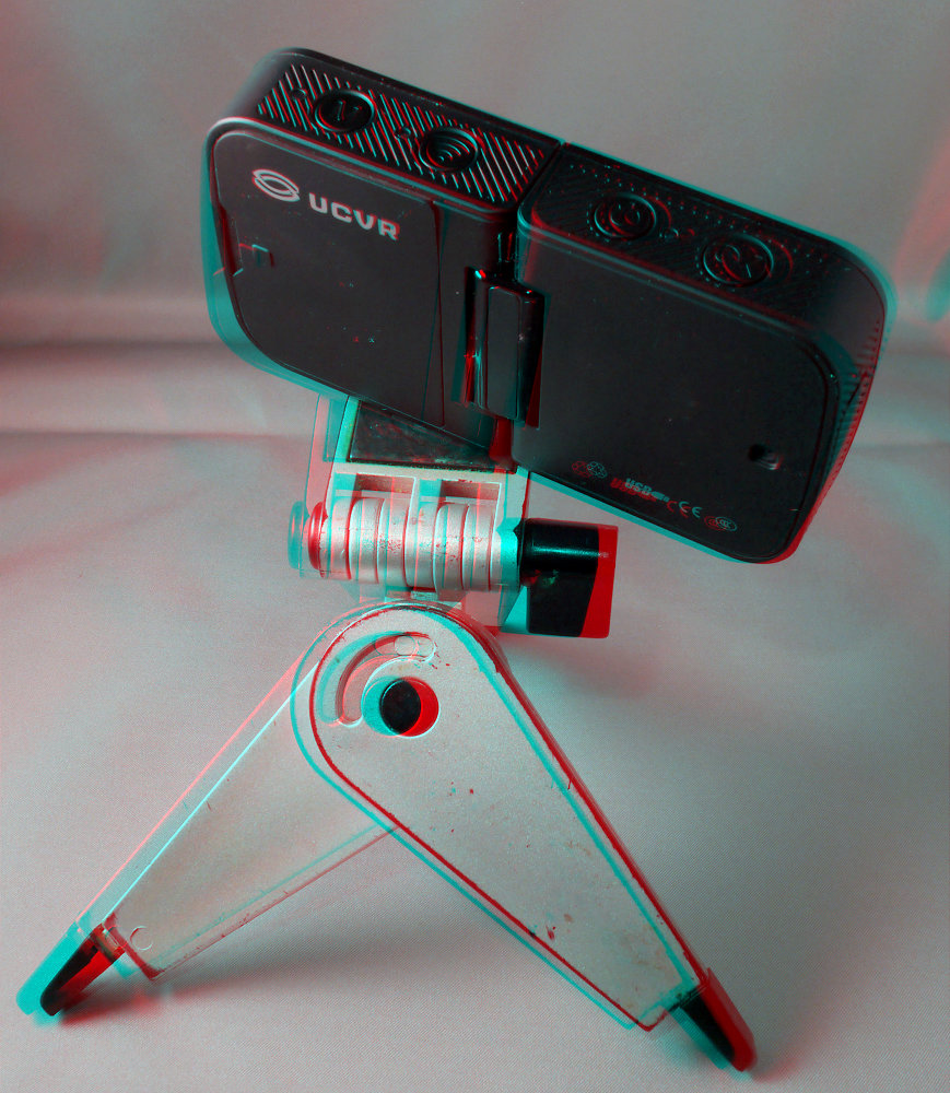 Le corps de l'appareil possède une charnière pour le déplier (mode 3D) ou le replier (mode 2D, les objectifs sont alors dos à dos).