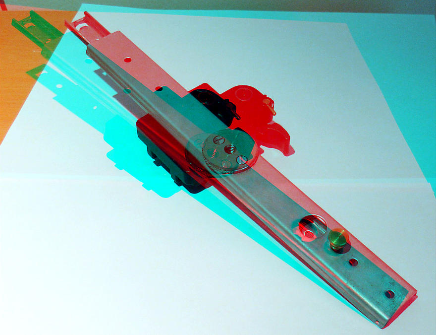 Une barrette pour la prise de vue en deux temps. La coulisse elle-même est un rail de tiroir qu'on peut trouver dans les magasins de bricolage. Celle-ci est équipée de roulements à billes permettant un déplacement facile. La vis en laiton permet de bloquer la coulisse dans une position donnée.