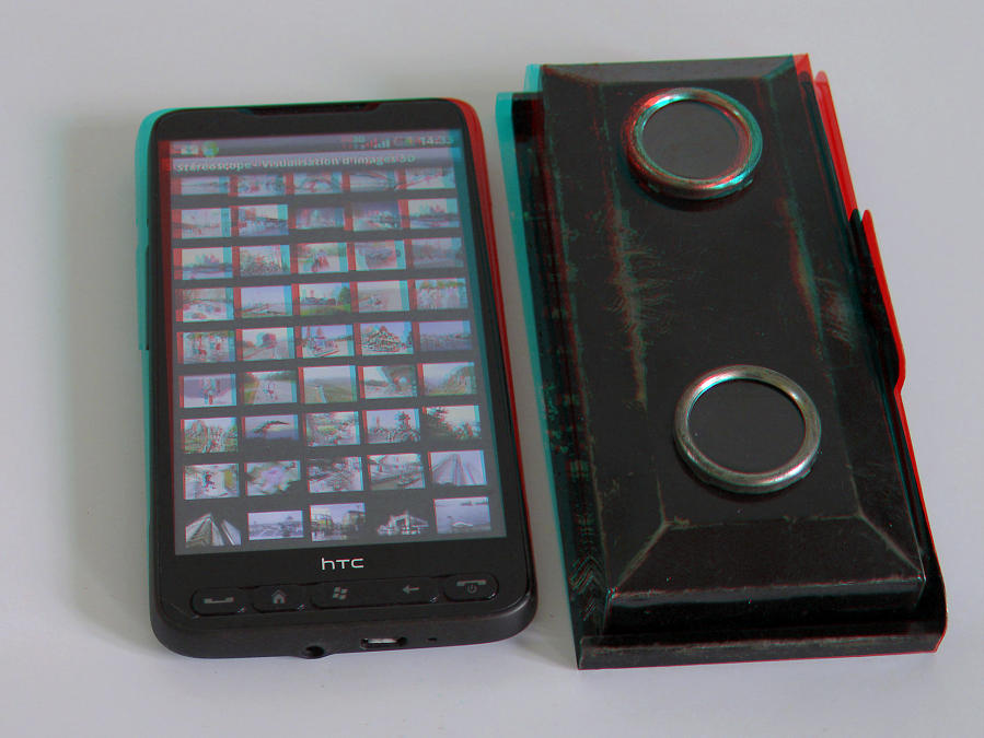 Téléphone HTC HD2 sous Android et un petit stéréoscope pliant pour vues papier.